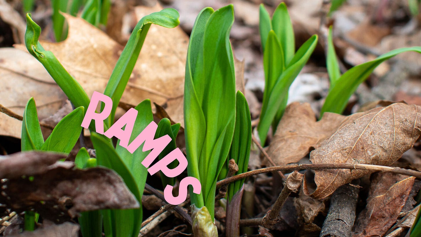 But back to the cooking. Ramps are one of the few traditionally foraged ingredients that have broken into mainstream American food media (bested perhaps only by morel mushrooms). As such, there’s no shortage of ramp recipes in the world - there’s even multiple other ramp soccas. I always prefer recipes that feel unfussy with a dispropriationaly big flavor payoff, so here are the top three I turn to and recommend: