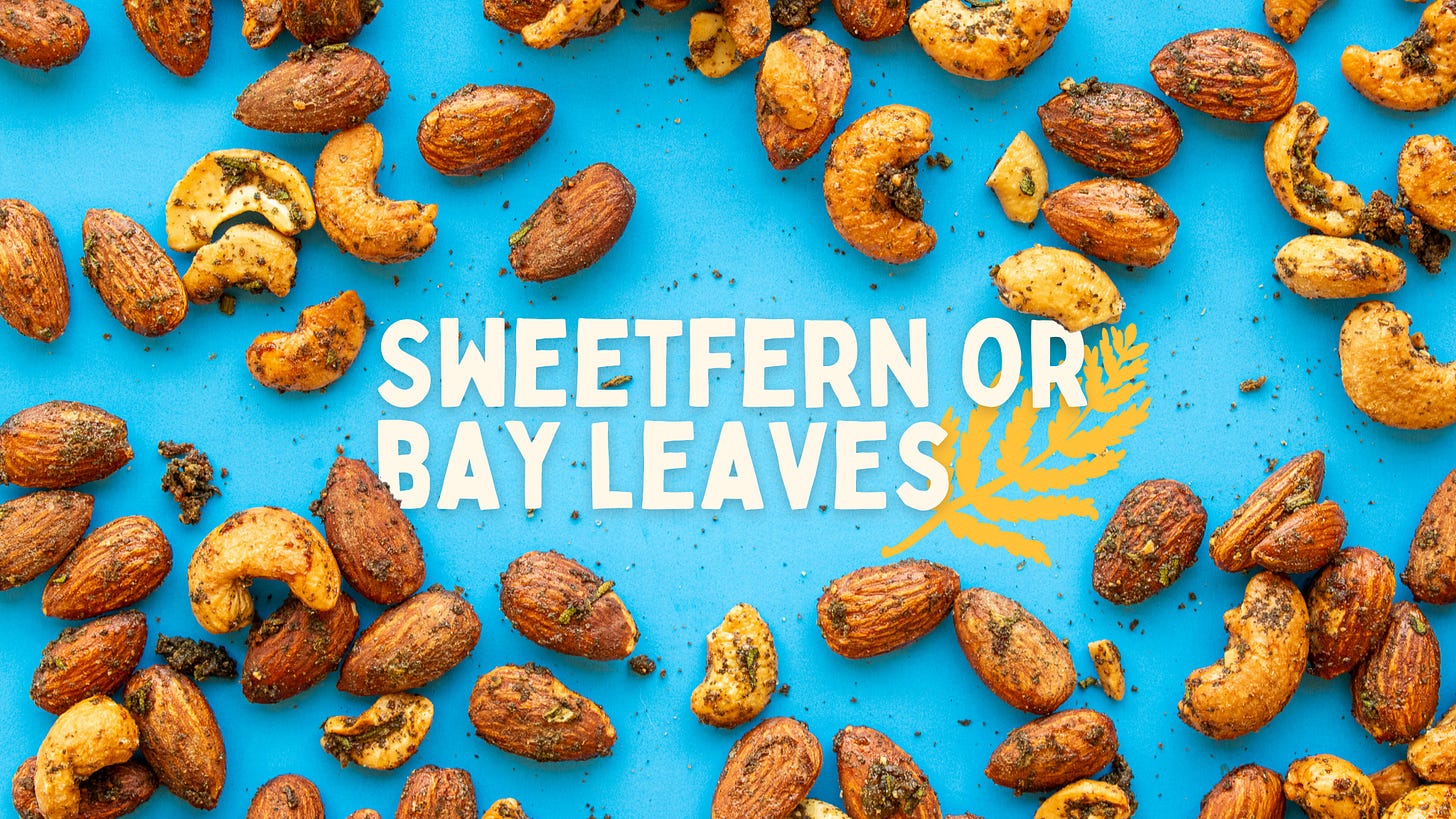 Sweetfern has a beautiful spicy-sweet aroma reminiscent of bay leaves. This uncomplicated recipe uses dried sweetfern leaves to add fragrance and flavor to mixed nuts. They stand on their own as a midday snack, but you can also crush these over a salad, use them to dress up hummus, or add them into the crust on a flaky fish.